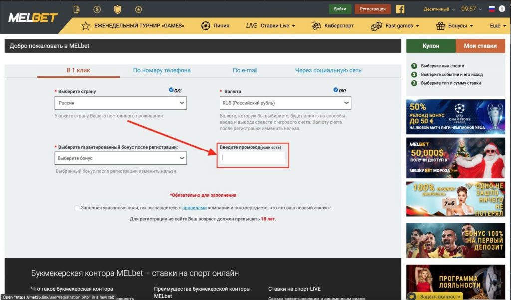 Затем нужно указать выбранный бонус и промокод (ml_47990). После этого следует подтвердить совершеннолетие и согласие с правилами букмекера. Регистрация завершена. Вся процедура занимает 2-3 минуты.