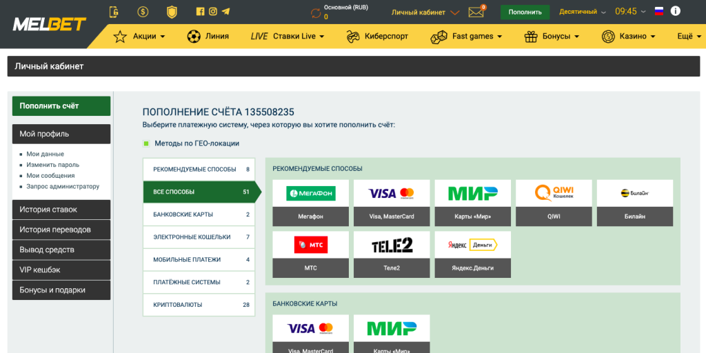 Пополнение игрового баланса на букмекерской конторы «Мелбет»